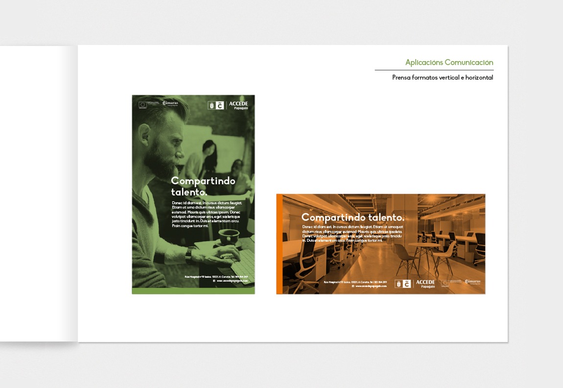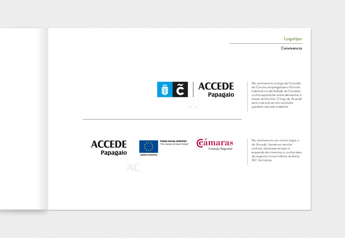 Desarrollo gráfico y Manual de Identidad Corporativa para la marca Accede Papagaio, espacio público de coworking y emprendimiento del Ayuntamiento de A Coruña.