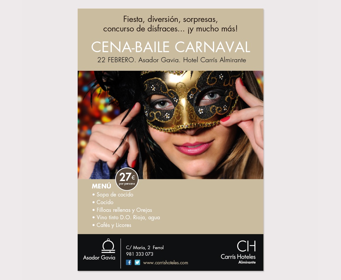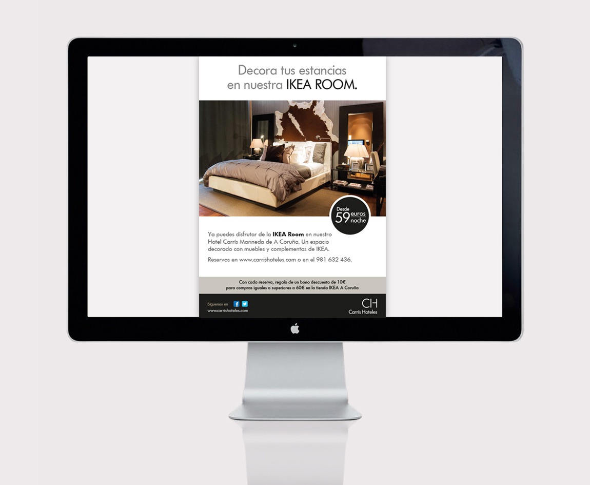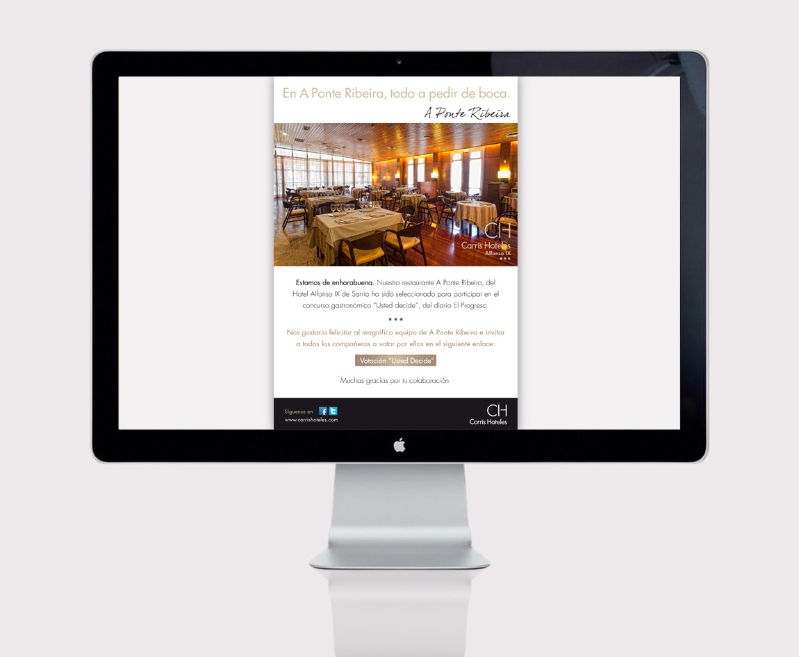 Durante todo 2014, realizamos distintas piezas de comunicación para la cadena hotelera Carrís Hoteles. Cartelería, mailings, newsletters, banners, propuesta de web, señalética y piezas específicas para sus hoteles de Oporto, Santiago, Ourense, Coruña y Ferrol.