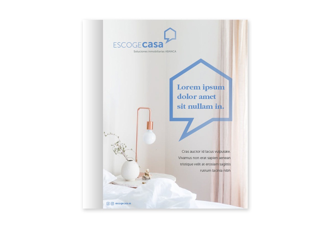 EscogeCasa, la división inmobiliaria de ABANCA, nos encarga el restyling de su logo y unas pautas de aplicación en distintas piezas publicitarias y de comunicación. Utilizamos el símbolo de la casa transformado en bocadillo, para expresar la idea de que, desee lo que desee el cliente, lo encontrará en este portal inmobiliario.