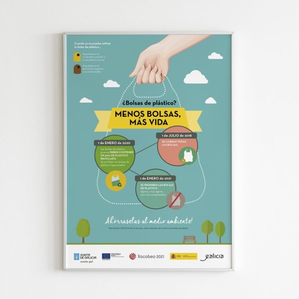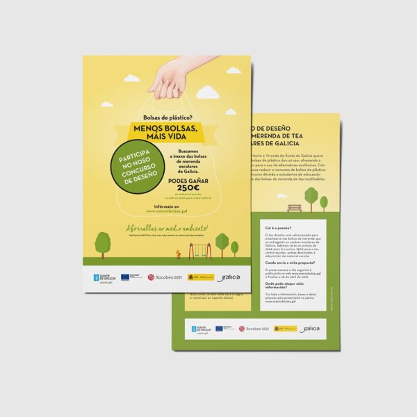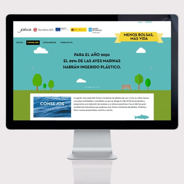 Desarrollo de campaña para promover la reducción del consumo de bolsas de plástico de un solo uso, realizada para la Consellería de Medio Ambiente, Territorio e Vivenda. Diseño de campaña, producción de piezas gráficas, desarrollo web, organización de concursos y actos de presentación, comunicación online / offline, promoción con instagramers y elaboración de piezas de merchandising.